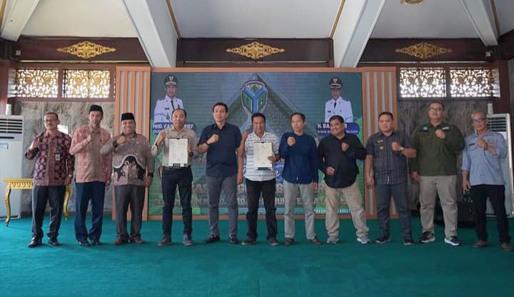 Batanghari, zonajambi.com - Bupati Batang Hari, Mhd Fadhil Arief menyaksikan secara langsung penandatanganan kerja sama Koperasi Tangguh Abadi Terusan (TAT) Kecamatan Maro Sebo Ilir Kabupaten Batang Hari dengan PT. Sawit Jambi Lestari (PT. SJL) Kamis, (10/8/2023) di Ruang Kaca Rumah Dinas Bupati Batang Hari.